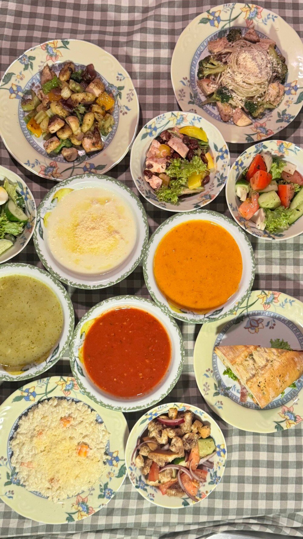 Салат Панцанела: красный лук, томаты, огурец, сухари, заправка Суп Томатный/суп Овощной Ризотто с креветками: рис, креветка, сливки, пармезан, цедра лимона